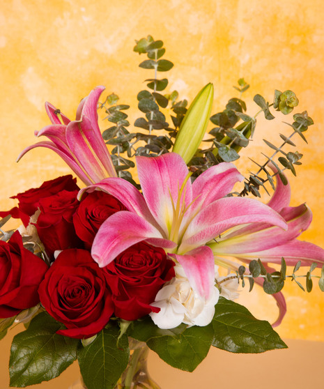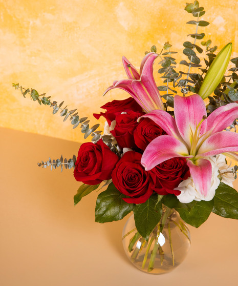 Adele is a timeless blend of romance and elegance, featuring classic red roses paired with graceful pink lilies and soft white accents. Designed with a natural, airy style, this arrangement creates a striking yet balanced presentation. Fresh greenery adds movement and texture, enhancing its overall sophistication. A beautiful choice for meaningful moments and heartfelt gestures.
