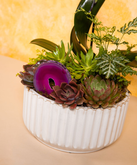 Botanical Beauty is a modern and elegant garden designed to impress. A stunning orchid rises above a curated collection of succulents and natural botanical accents. Clean lines and organic textures create a sophisticated, contemporary presentation. A long-lasting Mother’s Day gift that brings beauty and tranquility to any space.