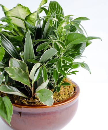 A mix of green and blooming plants in a ceramic container. This arrangement is sure to make a nice presentation and a long-lasting gift. Order this wonderful Dish Garden with same-day hand delivery to Orlando, Florida, or nationwide.