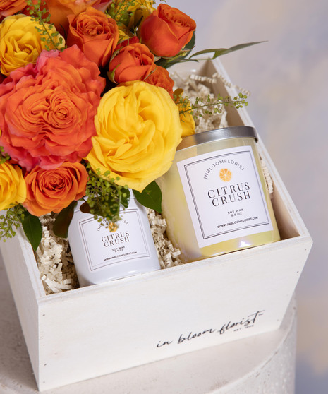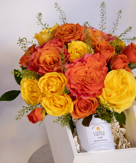 Citrus Crush Bloom Box is a vibrant gift that radiates warmth and energy. Sunny yellow and orange roses pair perfectly with the refreshing Citrus Crush candle duo. Designed in a keepsake wooden box, it feels bright, modern, and gift-ready. Perfect for birthdays, thank-yous, or cheerful everyday surprises.