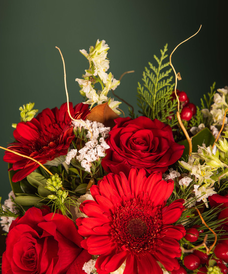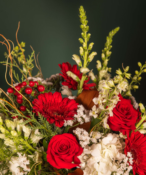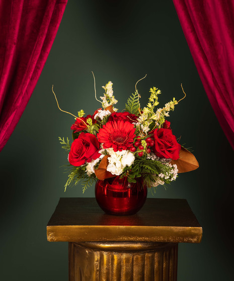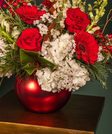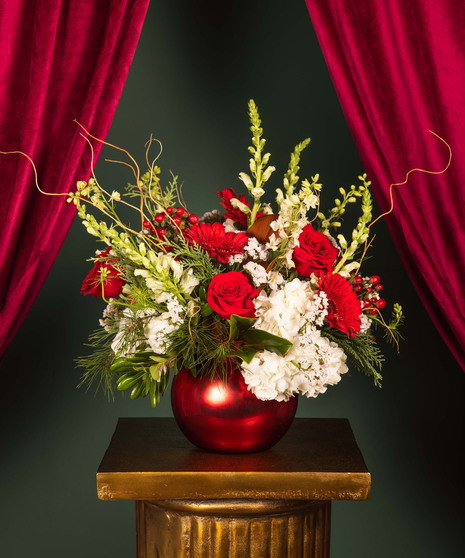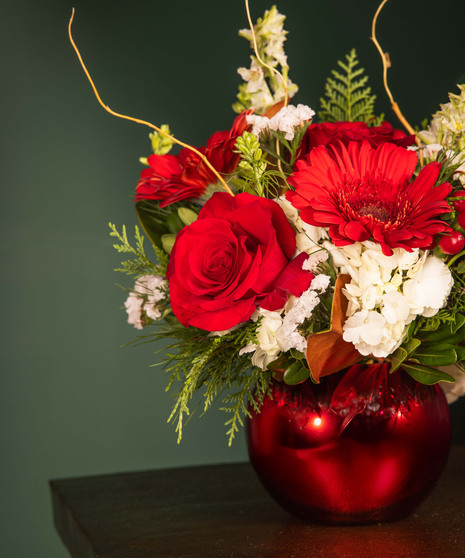 Radiate warmth and festive spirit with Crimson Cheer, a timeless holiday arrangement designed to brighten any space. Bursting with rich red blooms, crisp white accents, and lush greenery, this piece captures the joyful essence of the season. Arranged in a radiant red vase, it’s a perfect centerpiece or heartfelt gift to share holiday happiness.