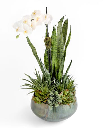 This deluxe handcrafted silk plant garden is designed to be enjoyed as a forever gift or decor piece in the home. The plants in this planter are comprised of 100% silk and make the perfect gift to last a lifetime. Add on a silk orchid to make a bigger impression with this long-lasting display.