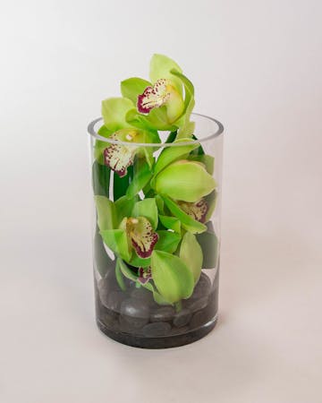 The simplistic design of our Elegant Orchids arrangement brings a tropical and contemporary feel to any home or office space! We carefully place an elegant cymbidium orchid stem with a monstera leaf on a bed of river rocks to create this serene arrangement.