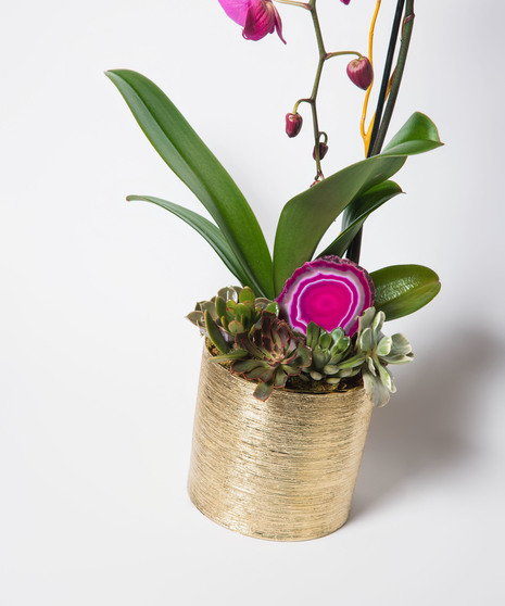 The plant person in your life will love the Blooming Beauty Orchid! Styled with a sleek agate slate, assorted succulents, and green moss designed in a modern gold square container, this orchid and succulent planter is the perfect way to show you care.