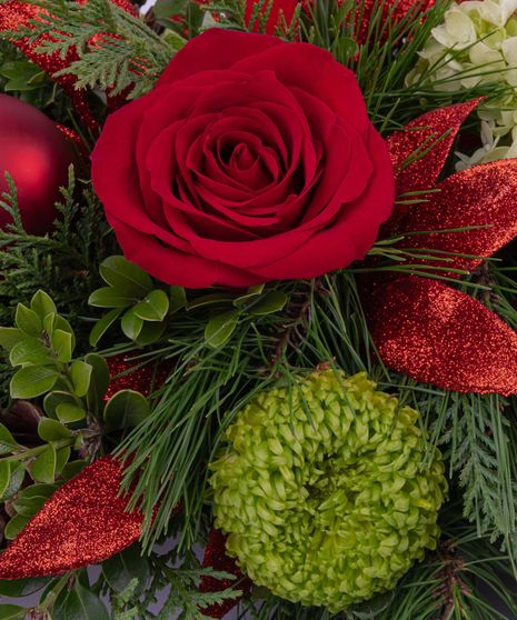 Flowers Included: Red roses, green hydrangeas, assorted winter greenery, pinecones, and glittered red leaves.