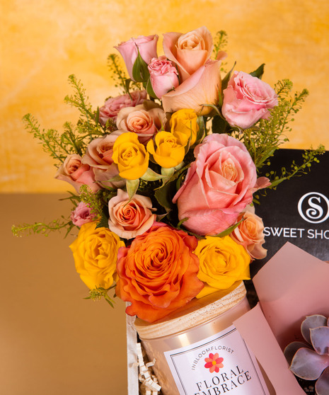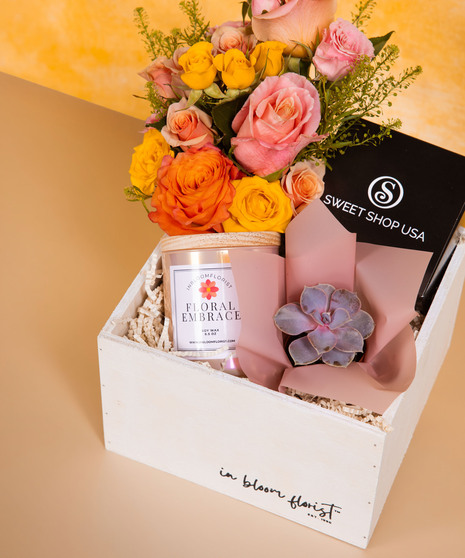 Floral Embrace Gift Box is a thoughtfully curated collection designed to make Mom feel truly special. Featuring fresh blooms, a beautiful succulent, artisan chocolates, and a fragrant candle, this gift offers a complete experience. Each element is carefully arranged in a keepsake wooden box for an elegant presentation. A meaningful and memorable Mother’s Day gift filled with warmth, beauty, and love.