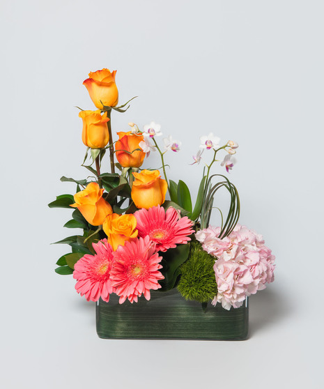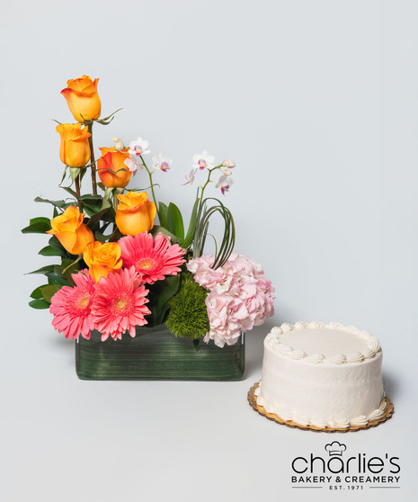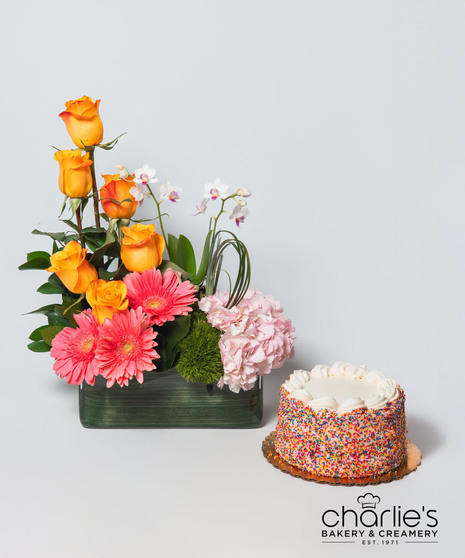 Bright and cheerful, the Florida Sunkissed Collection pairs a vibrant floral arrangement in sunny orange, pink, and golden hues with your choice of Charlie’s Bakery cupcakes or cake. A gift that radiates joy and sweetness for any celebration.