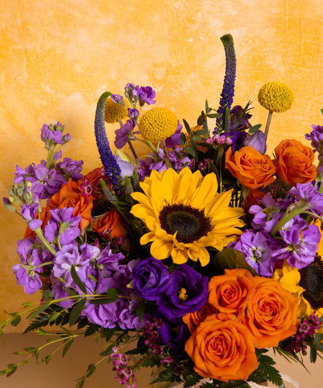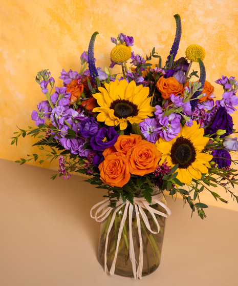 Fresh Start is a vibrant and cheerful arrangement designed to brighten Mom’s special day. Sunflowers, bright orange roses, and pops of purple blooms create a lively and refreshing garden-inspired design. Accented with lush greenery and finished with a natural ribbon, this bouquet feels warm and welcoming. A beautiful way to celebrate Mom and bring a fresh start to her Mother’s Day.