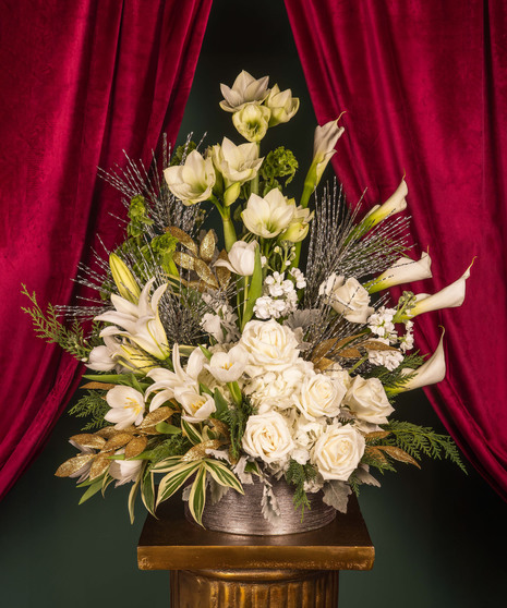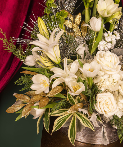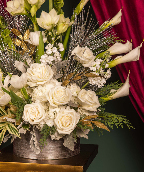 Elegant and luminous, Frosted Luxe captures the serene beauty of winter in full bloom. Featuring a stunning composition of white amaryllis, roses, lilies, and calla lilies accented with silver and gold touches, this luxurious arrangement radiates sophistication. Perfect for grand holiday displays, winter celebrations, or as a showpiece gift that embodies timeless elegance.