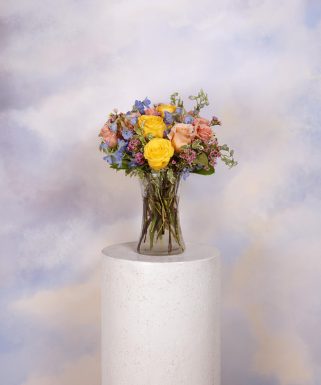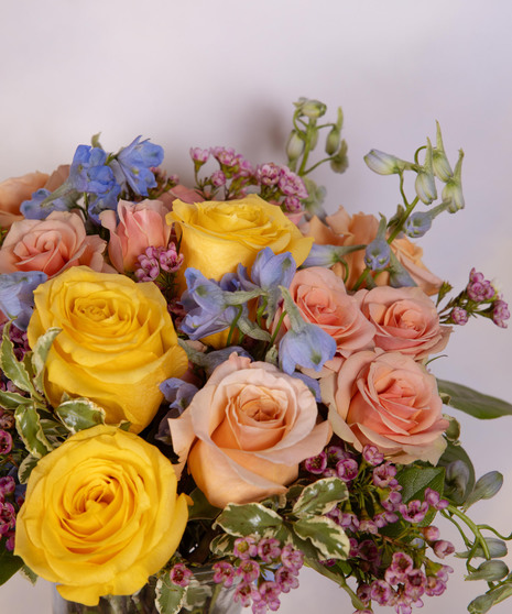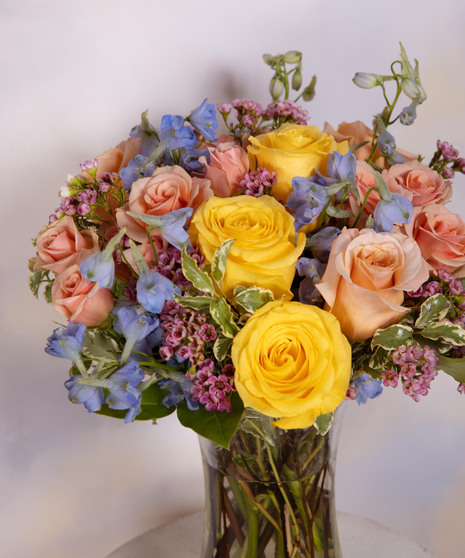 Frutta is a fresh, fruit-inspired mix bursting with sunny color. Golden yellow roses blend beautifully with soft peach blooms and airy blue accents. Designed in a clear glass vase, it feels light, cheerful, and effortlessly pretty. Perfect for birthdays, thank-yous, or bright everyday moments.
