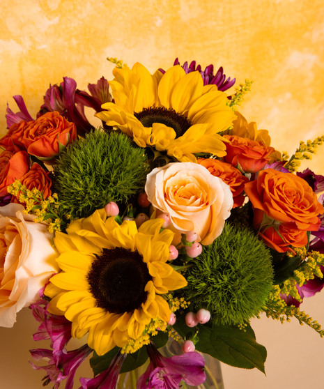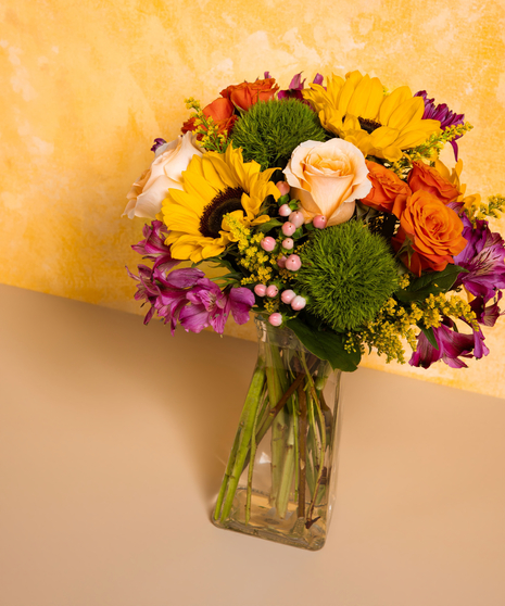 Great Vibes is a bright and cheerful arrangement designed to celebrate Mom with color and joy. Sunflowers, roses, and vibrant seasonal blooms create a playful mix full of warmth and personality. Designed in a modern glass vase with lush greenery and textural accents, this arrangement brings energy to any space. A fun and uplifting way to send Mom all the great vibes this Mother’s Day.