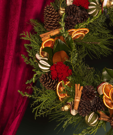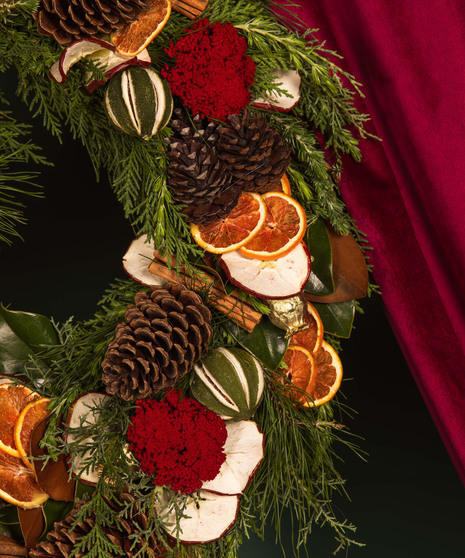 Rustic and inviting, the Holiday Harvest Wreath celebrates the warmth and abundance of the season. Crafted with fragrant evergreens, pinecones, dried citrus slices, cinnamon sticks, and festive accents, this handcrafted design brings natural charm and holiday spirit to any door or wall. A timeless piece that captures the essence of a cozy, classic Christmas.