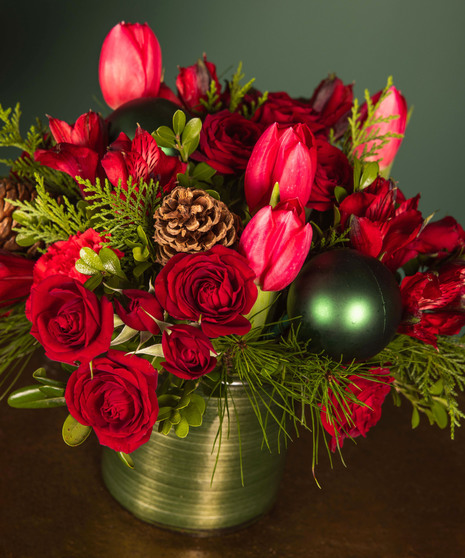 Radiant and full of cheer, Holiday Splendor brings the richness of the season to life. Featuring a lush mix of red blooms, pinecones, evergreens, and festive ornaments, this arrangement captures the warmth and sparkle of the holidays. Perfect for brightening your home or gifting a touch of seasonal elegance.