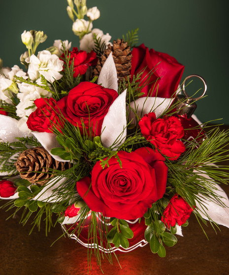 Festive and full of joy, Jingle Bell Blooms captures the cheerful energy of the holiday season. Featuring a lively mix of red and white blooms accented with pinecones, greenery, and a touch of sparkle, this arrangement is designed in a charming ornament-inspired vase. It’s the perfect way to add a merry touch to your home or send a warm holiday greeting to someone special.