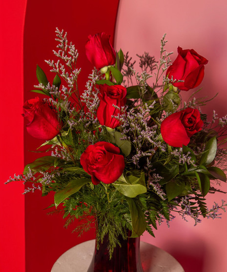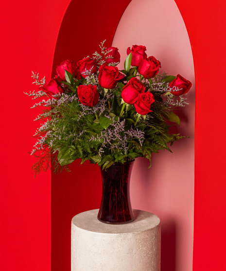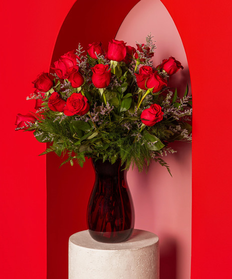 Variations of a medium stem red roses in a glass vase. Next Image