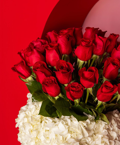 We put a modern twist on this bouquet of 36 medium stem roses when we accent them with heavenly hydrangea and hypericum berries and arrange them in an elegant tall glass vase. Luxe Roses is sure to dazzle that special someone.