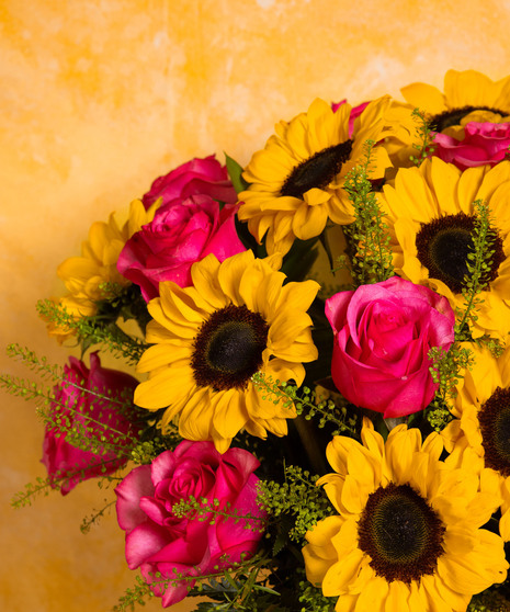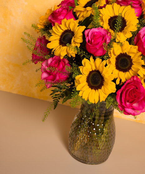 Magenta Sunset bursts with vibrant color and cheerful beauty, perfect for celebrating Mom. Bright sunflowers paired with bold magenta roses create a warm, joyful design full of energy and charm. Lush greenery adds texture and balance to this eye-catching arrangement. A radiant bouquet designed to brighten Mom’s day and make her feel truly celebrated.
