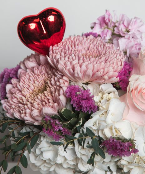 Delight someone special with this soft and romantic arrangement that radiates understated elegance. A playful pop of charm is added with a shiny red heart, making it the perfect gesture for expressing affection or celebrating love.
