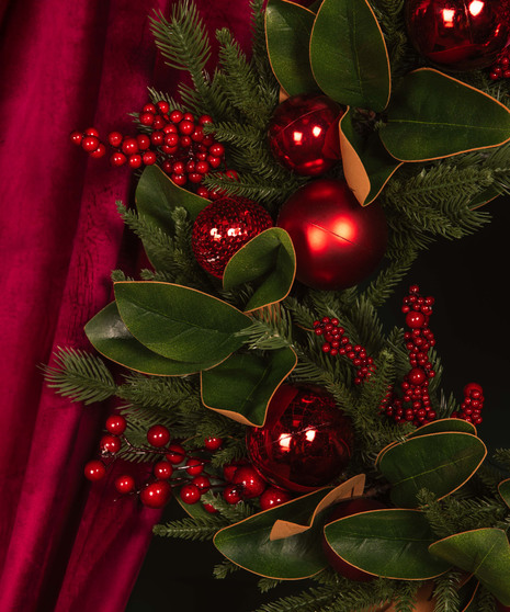 Elegant and festive, the Merry Magnolia Silk Wreath brings a touch of holiday luxury to your home. Designed with lifelike magnolia leaves, vibrant red berries, and gleaming ornaments, this silk wreath combines timeless charm with lasting beauty. Perfect for doors, mantels, or walls, it’s a stunning way to welcome the season year after year.