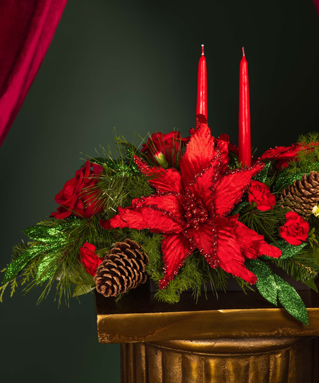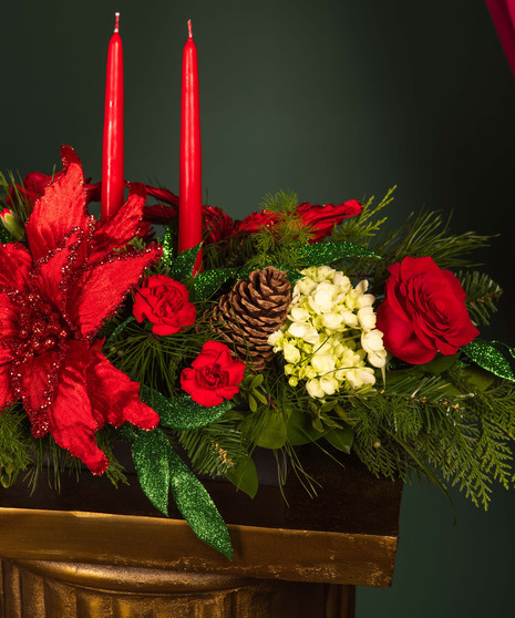 Classic and festive, the Merry Moments Centerpiece is designed to bring warmth and cheer to every holiday table. Featuring vibrant red blooms, lush evergreens, pinecones, and shimmering accents surrounding elegant taper candles, this arrangement sets the perfect mood for holiday gatherings and celebrations. A timeless favorite that embodies the joy of the season.