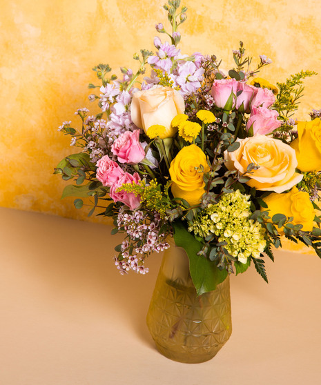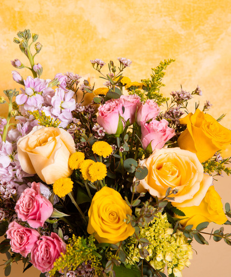Sweet Sunshine is a cheerful and uplifting arrangement designed to brighten Mom’s day. Warm yellow roses and soft pastel blooms create a joyful and radiant presentation. Lush greenery and delicate textures add depth and natural beauty to the design. A bright and heartfelt way to celebrate Mom and bring sunshine to her Mother’s Day.