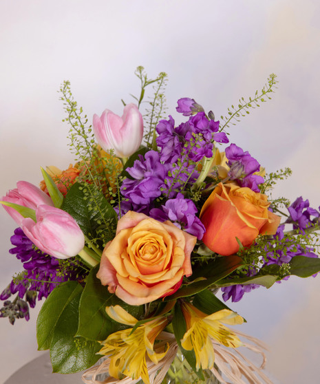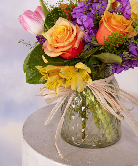 Morning Blossom is a sweet burst of color inspired by a fresh spring morning. Soft tulips and warm roses are accented with cheerful seasonal blooms for a lively garden feel. Designed in a textured glass vase with natural raffia detail, it feels bright, airy, and charming. Perfect for birthdays, thank-yous, or simply starting someone’s day with a smile.