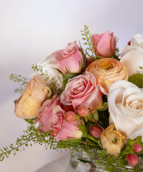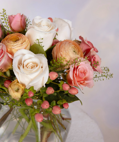 Peaches & Cream is a soft and romantic floral design filled with delicate pastel beauty. Blush roses, creamy white roses, and peach ranunculus blend together in a charming glass vase. Accents of hypericum berries and airy greenery add natural texture and movement. Perfect for birthdays, thank-you gifts, or adding a sweet touch of spring to any space.
