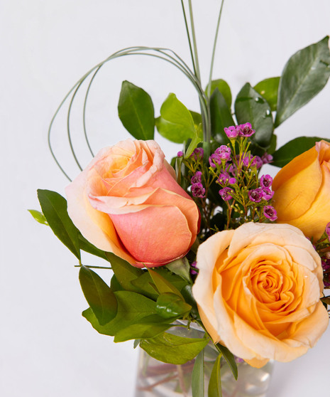 Soft, sunny, and effortlessly charming—this petite bouquet is a sweet escape into spring. Featuring a dreamy mix of peach, blush, and golden-hued roses accented with dainty lavender blooms and fresh greenery, Peachy Daydream is perfect for brightening desks, countertops, or someone’s day.