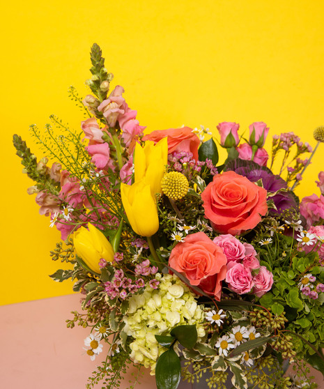 Please note: The image shown reflects the look, feel, and style of the design, however, exact floral varieties may vary.