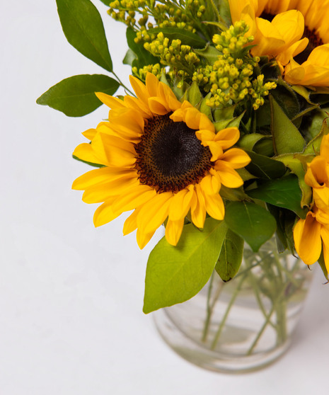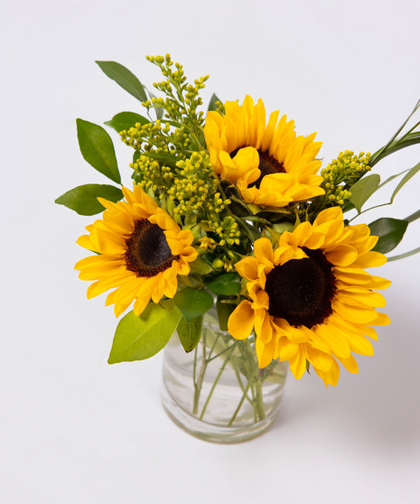 Brighten their day with a burst of sunshine! This petite arrangement features vibrant yellow sunflowers, playful greenery, and fresh accents in a sleek glass vase. Simple, sunny, and full of joy, Pocketful of Sunshine is the perfect little pick-me-up for any occasion—or just because.