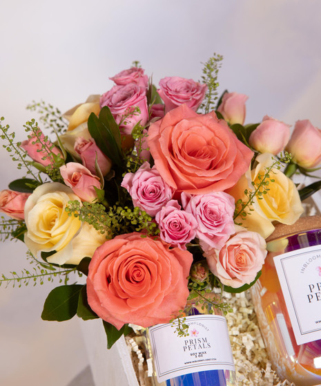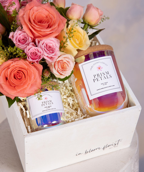 Prism Petals Bloom Box is a vibrant gift that blends fresh blooms with colorful candlelight. Soft roses in peach, blush, and cream create a cheerful floral display. Paired with the Prism Petals candle duo, it adds a radiant glow and uplifting fragrance. Designed in a keepsake wooden box, it’s perfect for birthdays, celebrations, or thoughtful everyday gifting.