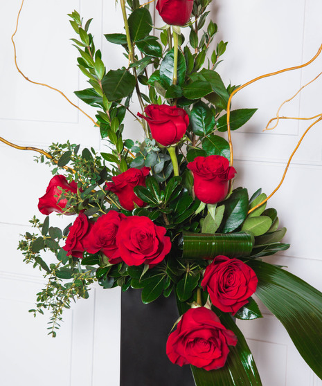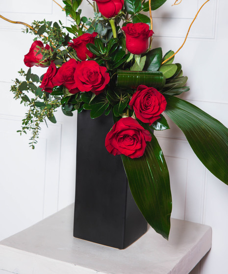 We put a twist on the classic dozen roses to create this modern ascending spiral rose design! The Rose Amore oozes elegance and romance. The tower of 12 roses dances with twigs of curly willow and textural greenery in a contemporary matte black ceramic vase.