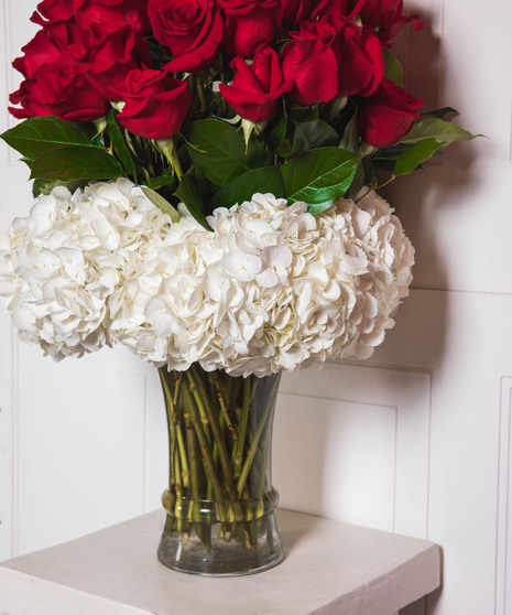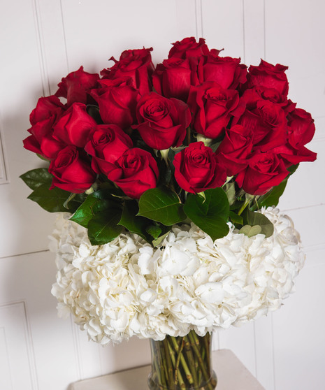 We put a modern twist on this bouquet of 36 medium stem roses when we accent them with heavenly hydrangea and hypericum berries and arrange them in an elegant tall glass vase. Luxe Roses is sure to dazzle that special someone.