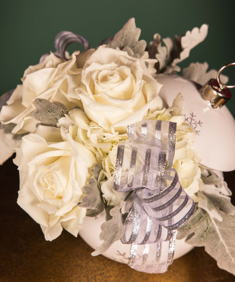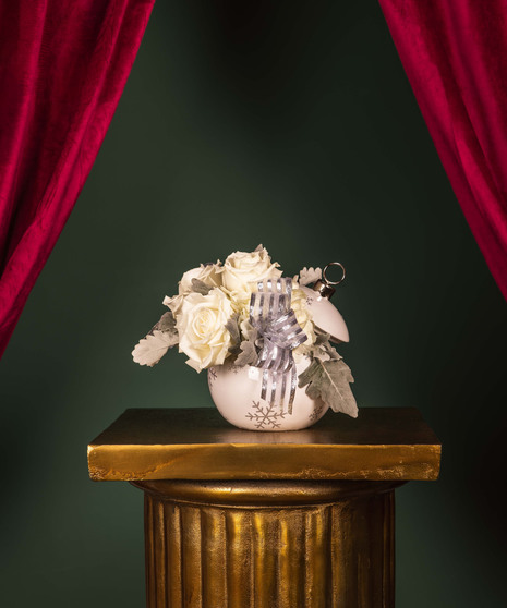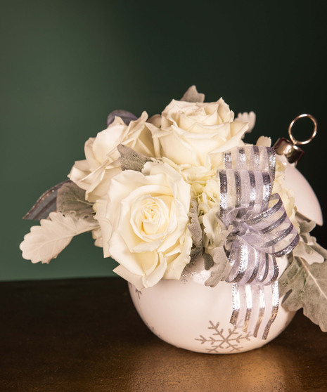 Graceful and serene, Silver Bells embodies the elegance of a winter wonderland. Featuring soft white blooms nestled in a shimmering ornament-inspired vase with silver snowflake accents and ribbon detail, this design brings a touch of sophistication to the season. Perfect for holiday gifting, intimate gatherings, or adding a refined sparkle to your décor.