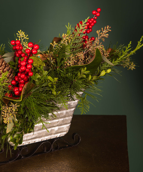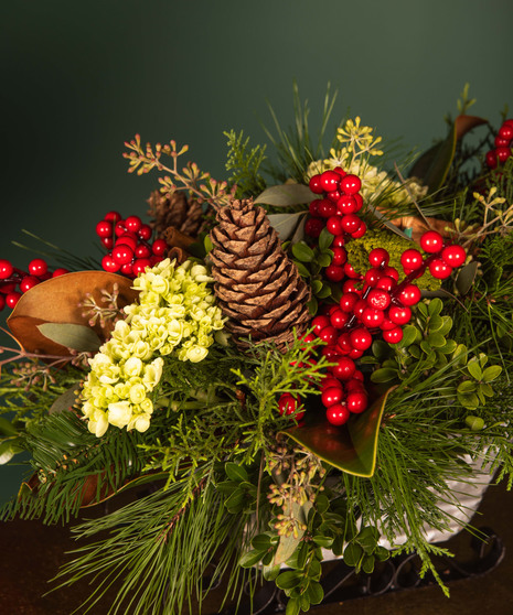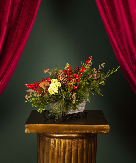 Sleigh Ride evokes the nostalgic charm of a cozy winter outing. Bursting with vibrant red berries, lush evergreens, pinecones, and golden accents, this festive design is arranged in a keepsake sleigh-inspired container. A cheerful and timeless piece that perfectly captures the joy and spirit of the holiday season — ideal for a centerpiece or seasonal gift.