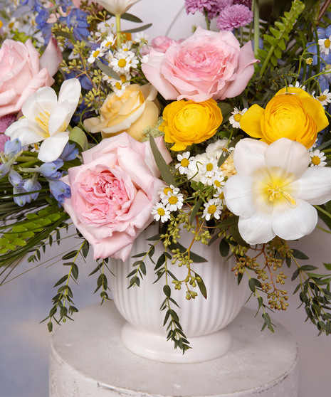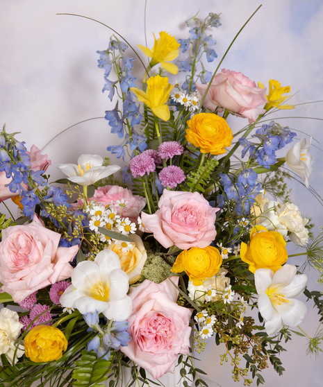 Spectacular Spring is a lush garden-style arrangement bursting with seasonal beauty. Soft blush roses, cheerful yellow blooms, and airy blue accents create a fresh spring palette. Designed with natural movement and texture in a classic white vessel, it feels elegant and vibrant. Perfect for celebrations, Easter gatherings, or welcoming the joy of the season.