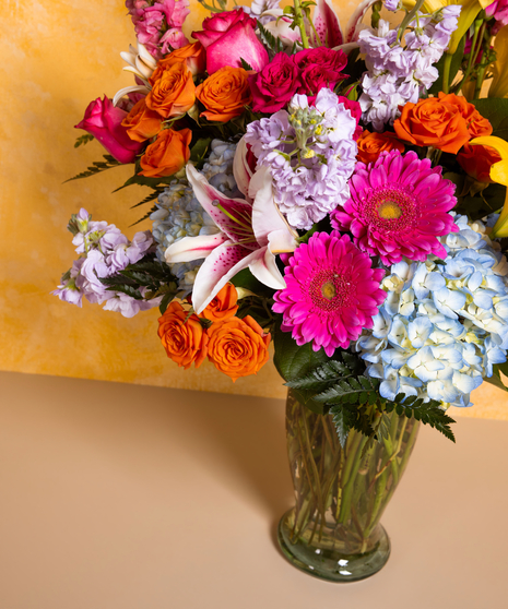 Spring Erin is a vibrant celebration of color designed to brighten Mom’s special day. A beautiful mix of roses, lilies, hydrangea, and seasonal blooms creates a lush and cheerful presentation. Soft pastels blend with bold, bright tones for a perfectly balanced and eye-catching arrangement. A joyful and abundant design that makes Mom feel loved, appreciated, and celebrated this Mother’s Day.