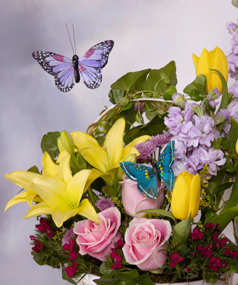 Springtime Basket is a cheerful garden mix full of fresh seasonal color. Sunny lilies and tulips pair beautifully with soft roses and playful accents. Designed in a classic white basket with whimsical butterfly detail, it feels bright and full of spring charm. Perfect for Easter, birthdays, or sweet seasonal surprises.