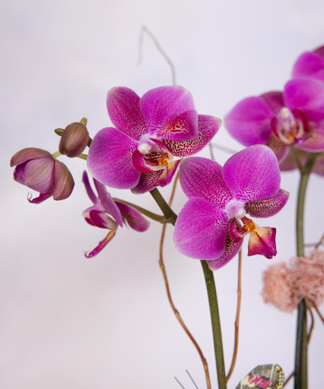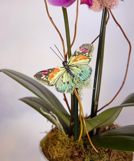 Spring Orchid Standard is a graceful blooming orchid that brings modern elegance to any space. Vibrant phalaenopsis blooms rise above lush green leaves in a sleek white planter. Natural moss, curly branches, and a delicate butterfly accent add a whimsical spring touch. Perfect for birthdays, thank-you gifts, or brightening a home or office.