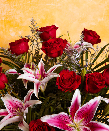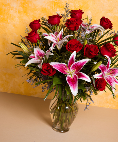 Superstar is a bold and stunning arrangement designed to celebrate Mom like the star she is. Vibrant red roses and striking stargazer lilies create a dramatic and elegant presentation full of beauty and fragrance. Lush greenery and delicate accents complete this timeless and luxurious design. A show-stopping arrangement perfect for making Mom feel like a true superstar this Mother’s Day.