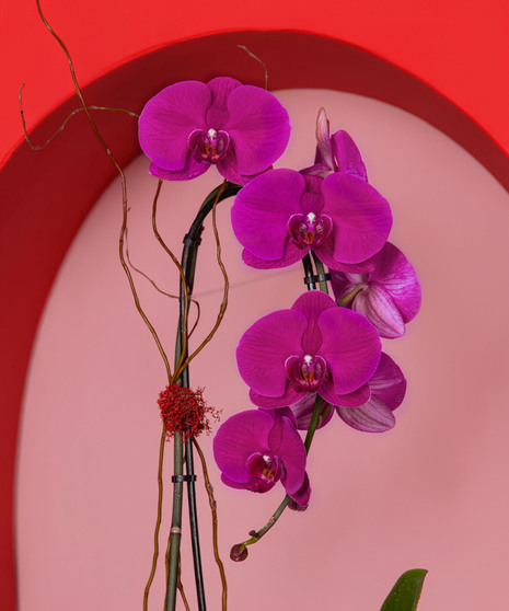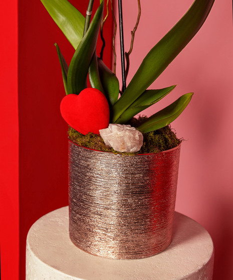 Velvet Kiss is the epitome of elegance. Featuring vibrant magenta orchids thoughtfully arranged in a shimmering rose gold cylinder, this design exudes sophistication and charm. Accented with a delicate rose quartz crystal to symbolize love and positive energy, this arrangement is perfect as a gift for a loved one, to elevate the ambiance of your home, or to create a stunning welcome for guests at your business.