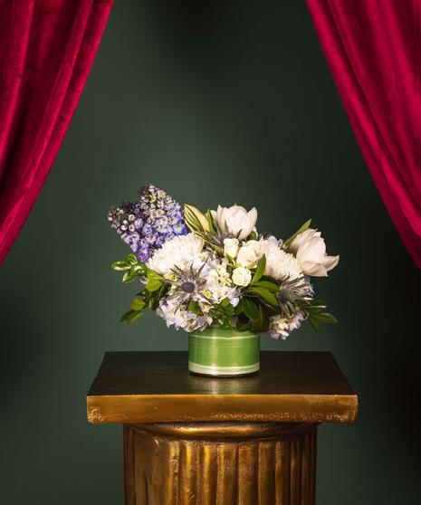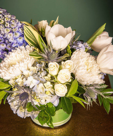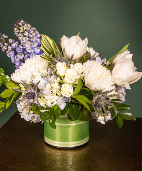 Part of our Holiday & Hanukkah Collection, the Winter Serenity arrangement captures the peaceful beauty of the season. A stunning mix of white, silver, and soft blue blooms — including hydrangea, tulips, and delphinium — are artfully arranged with winter greenery for a look that’s both serene and sophisticated. Ideal for celebrating Hanukkah, gifting, or adding a refined winter touch to your home décor.