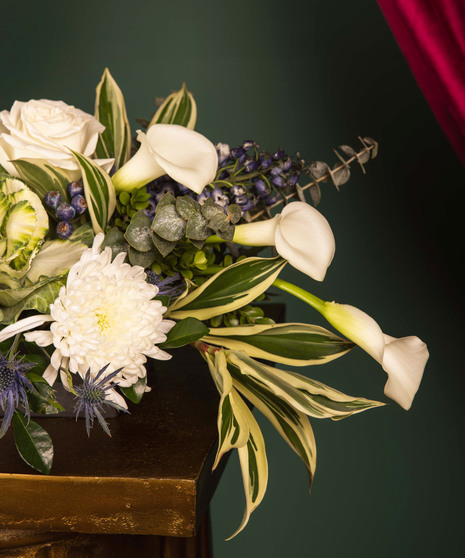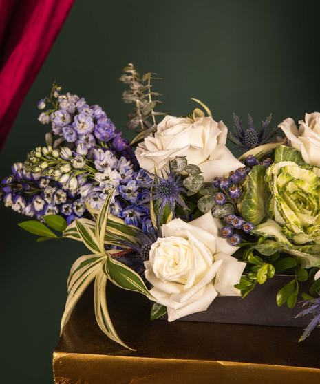 Our Winter Serenity Centerpiece brings calm sophistication to your seasonal table. Featuring elegant white and soft blue blooms — including roses, calla lilies, and delphinium — accented with winter greenery and silver-blue textures, this design evokes the peaceful glow of the season. Perfect for Hanukkah gatherings or as a modern winter holiday centerpiece.