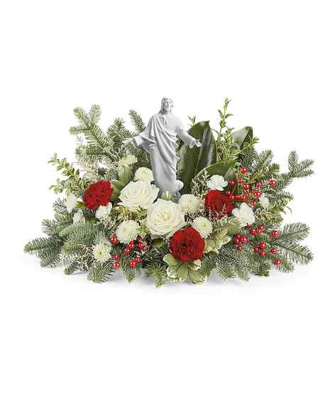 Celebrate peace and grace with the Heavenly Peace Bouquet, featuring a serene sculpture of Jesus surrounded by a beautiful display of red and white blooms. This elegant bouquet includes red roses, white roses, red carnations, and white spray chrysanthemums, all accented with seasonal greenery and festive red berries. The radiant combination of flowers and the peaceful presence of the keepsake statue make this arrangement a heartfelt tribute, perfect for offering comfort and serenity during moments of reflection or celebration. A lasting symbol of faith, this arrangement will be cherished long after the blooms have faded.