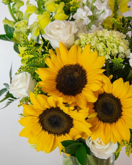 There are a few different ways to say "get well soon!" with flowers, and choosing flower varieties for their symbolism is one way to display your thoughtfulness. Carnations represent good luck, asters represent cheerful wishes, sunflowers represent optimism and long life, daisies symbolize cheerfulness, yellow and orange roses represent positivity, and chrysanthemums symbolize fidelity and long life.