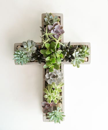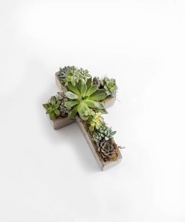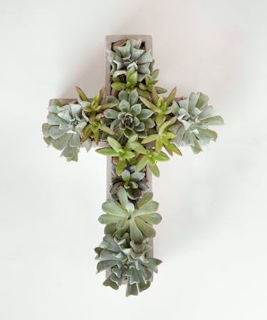 This striking display of succulents in a modern concrete cross container will send your heartfelt expressions when words just aren't enough. Each Peaceful Succulents garden is hand-crafted with locally-sourced succulents, moss, and natural rocks, making the perfect lasting gift of comfort.