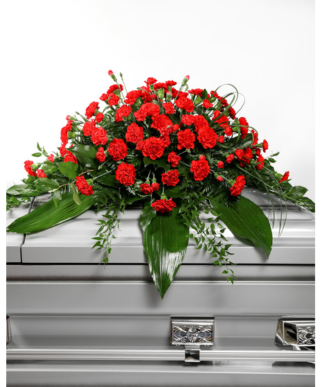 This classic half-couch spray of brilliant red carnations makes a striking and dignified statement during the final farewell service.